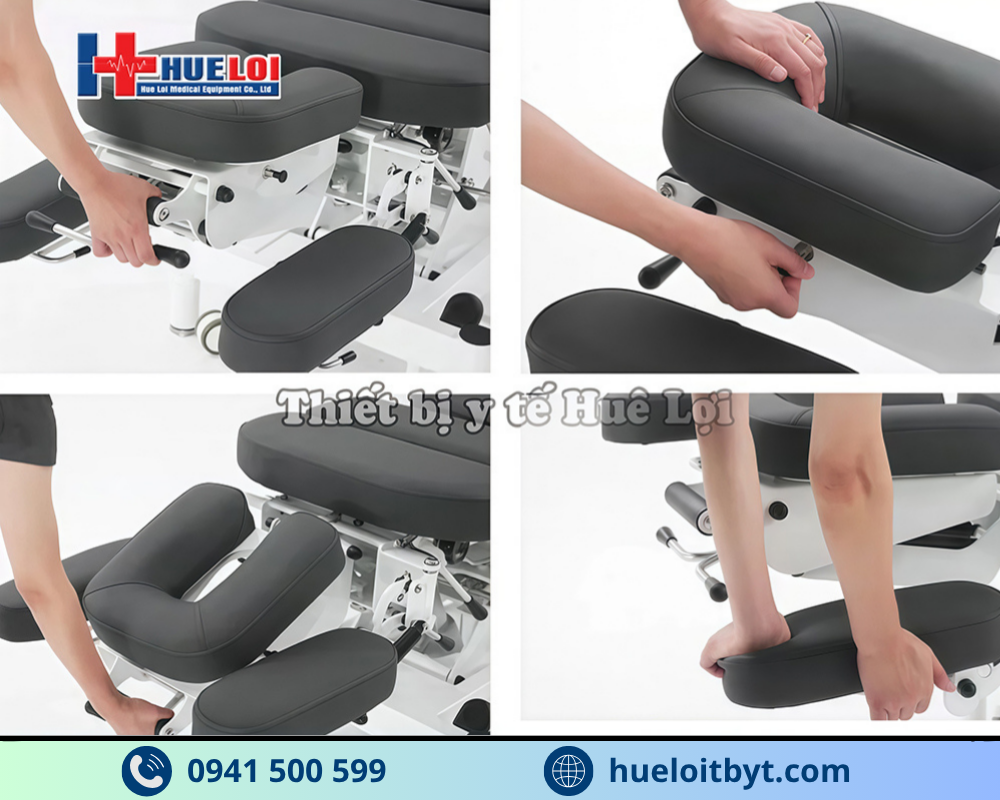 Vùng đầu: có khả năng điều chỉnh nâng hạ từ -15° đến +35°, đồng thời có thể nghiêng trái – phải để hỗ trợ các thao tác trị liệu chính xác hơn.